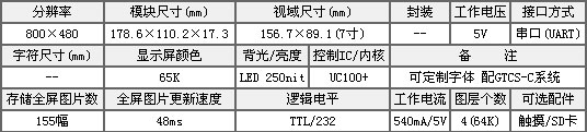 - 描述:顯示點(diǎn)陣:800X480,品牌:金鵬 TFT彩屏,模塊尺寸:178.6X110.2X17.3 視域尺寸:156.7X89.1