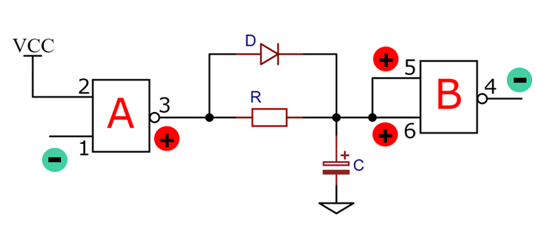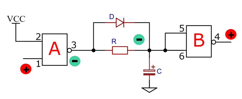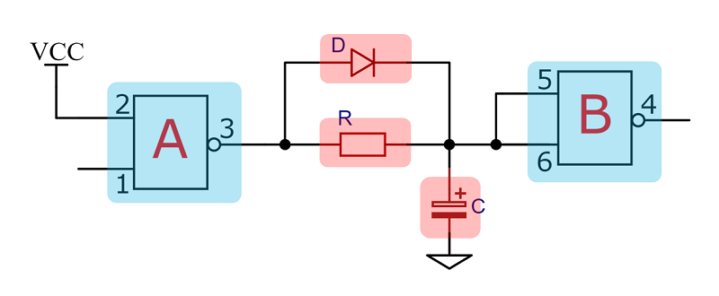 圖5為電路原理圖,它由兩個(gè)與非門外加阻容器件串聯(lián)而成。
