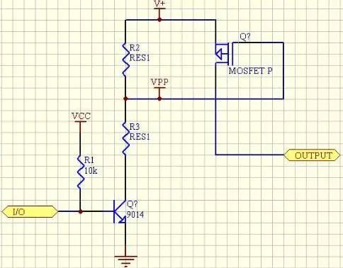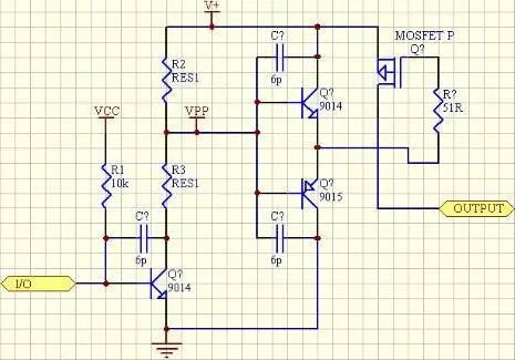 其中R1=10K,R2、R3大小由V+決定,V+越高,R2、R3越大,以保證電阻及三極管功耗在允許范圍,同時保證R2和R3的分壓VPP=V+ 減10V,同時V+不能大于40V。