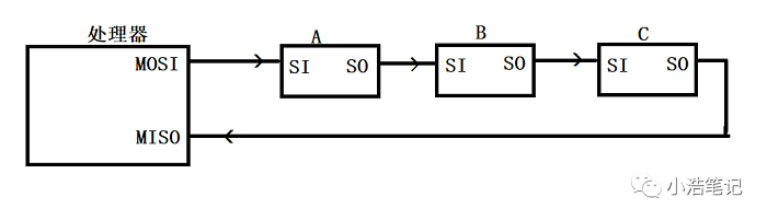 其他外設只需要一個單字節(jié)(比如一個發(fā)給A/D轉換器的命令),有些甚至還支持菊花鏈連接,菊花鏈連接三臺SPI設備,如下圖: